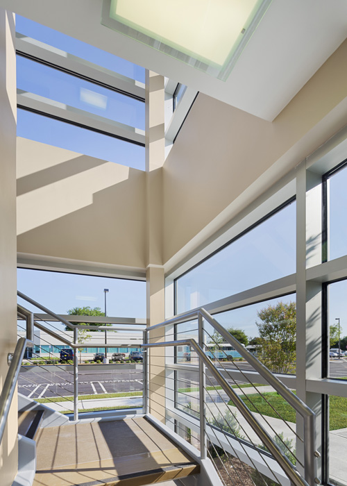 Outros destaques dessa construção, incluem dois andares de um átrio totalmente envidraçado e uma escadaria monumental. A fachada exterior é uma parede de cortina envidraçada e sistema de revestimento EIFS para um visual moderno e bonito. O acabamento do prédio foi feito em tons quentes e suaves, tendo paredes pintadas com toques de vinil, incluindo pisos de cerâmica e carpete.